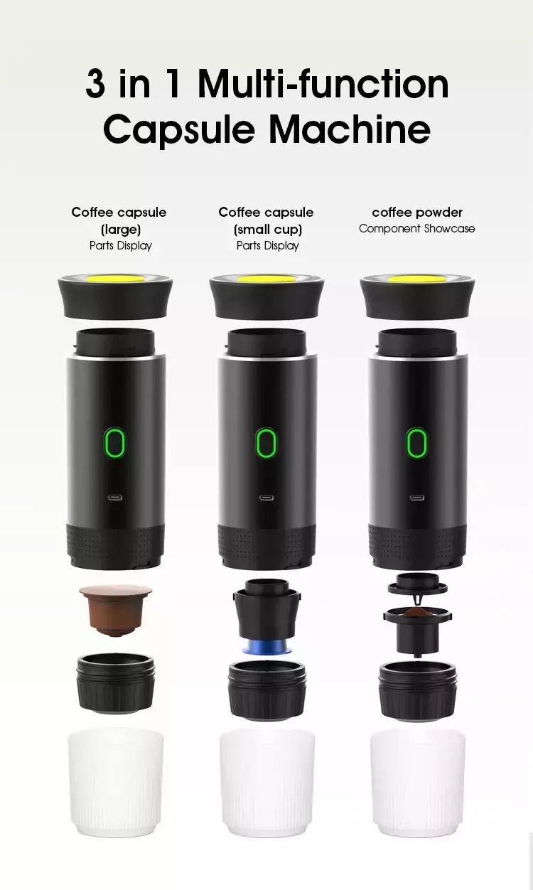?Multicompatível?A máquina de café expresso portátil 3 em 1 está equipada com um compartimento de café moído e um compartimento de cápsulas, que é compatível com cápsulas pequenas e grandes e café moído.Compartimento de água em aço inoxidável.Extração de alta pressão de 15Bar.