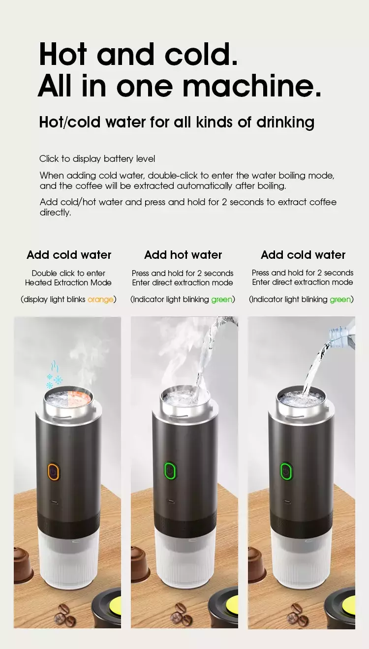 ?Extração inteligente?A máquina de café expresso portátil adota função de aquecimento inteligente, extração conveniente, clique duas vezes no botão liga / desliga, abra a função de extração de aquecimento, extração de aquecimento.Pressione longamente o botão liga / desliga, abra diretamente a função de extração, operação conveniente, adequada para todos os tipos de água potável quente / fria.