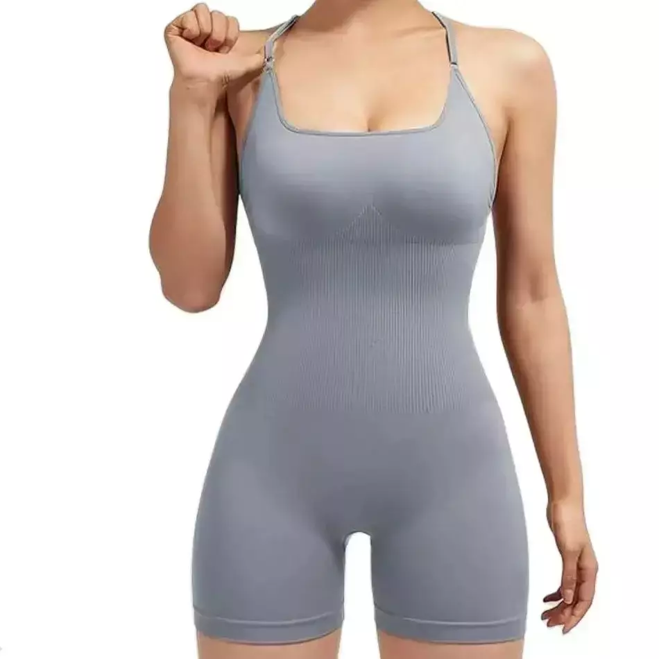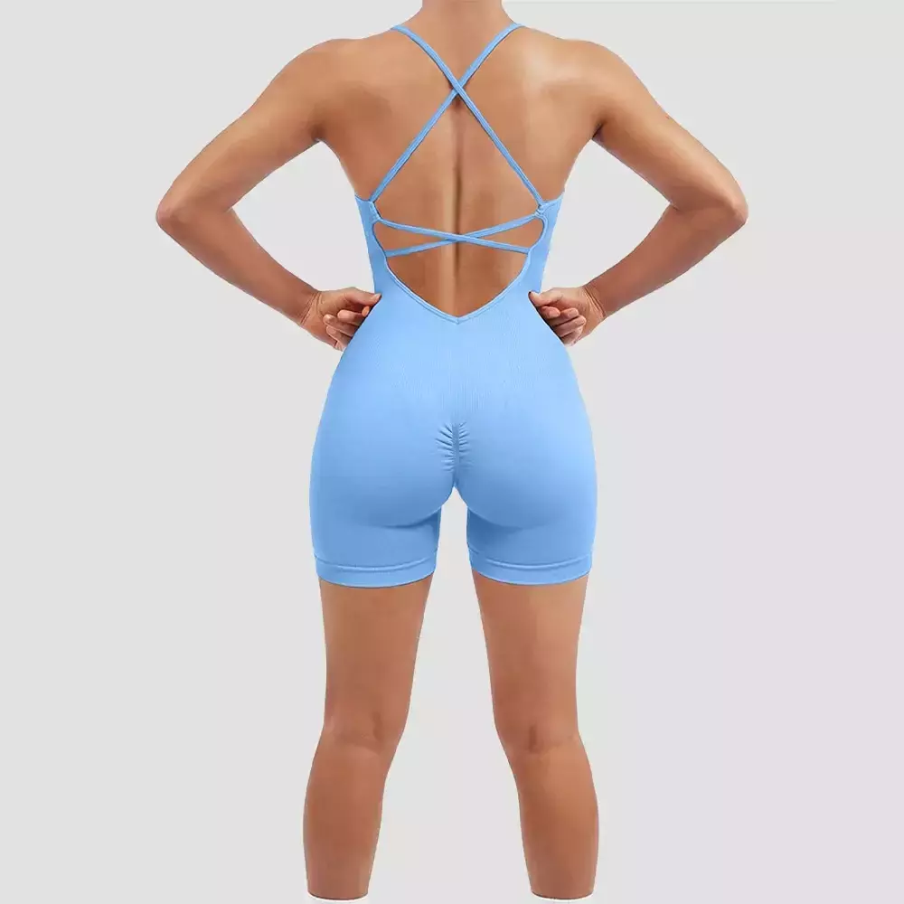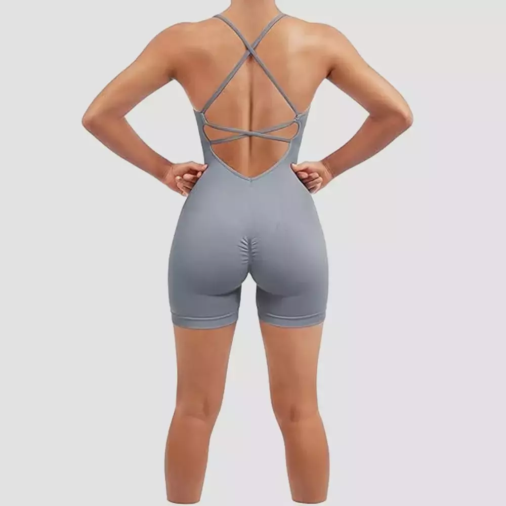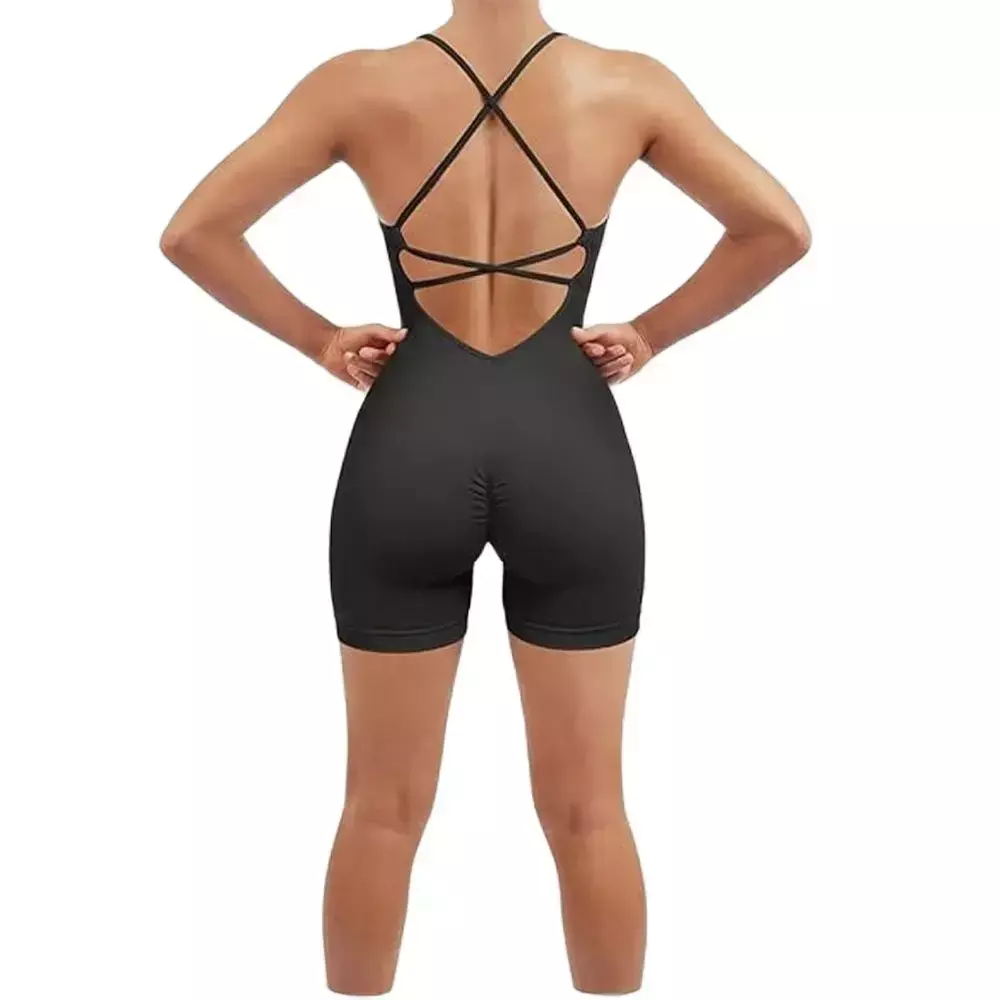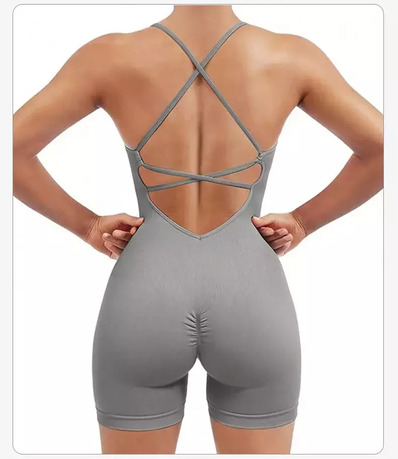 [Nome do produto]: Shorts de macacão apertados com alça cruzada nas costas da moda